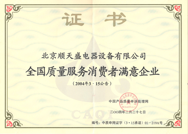 • 全國質量服務消費者滿意企業證書